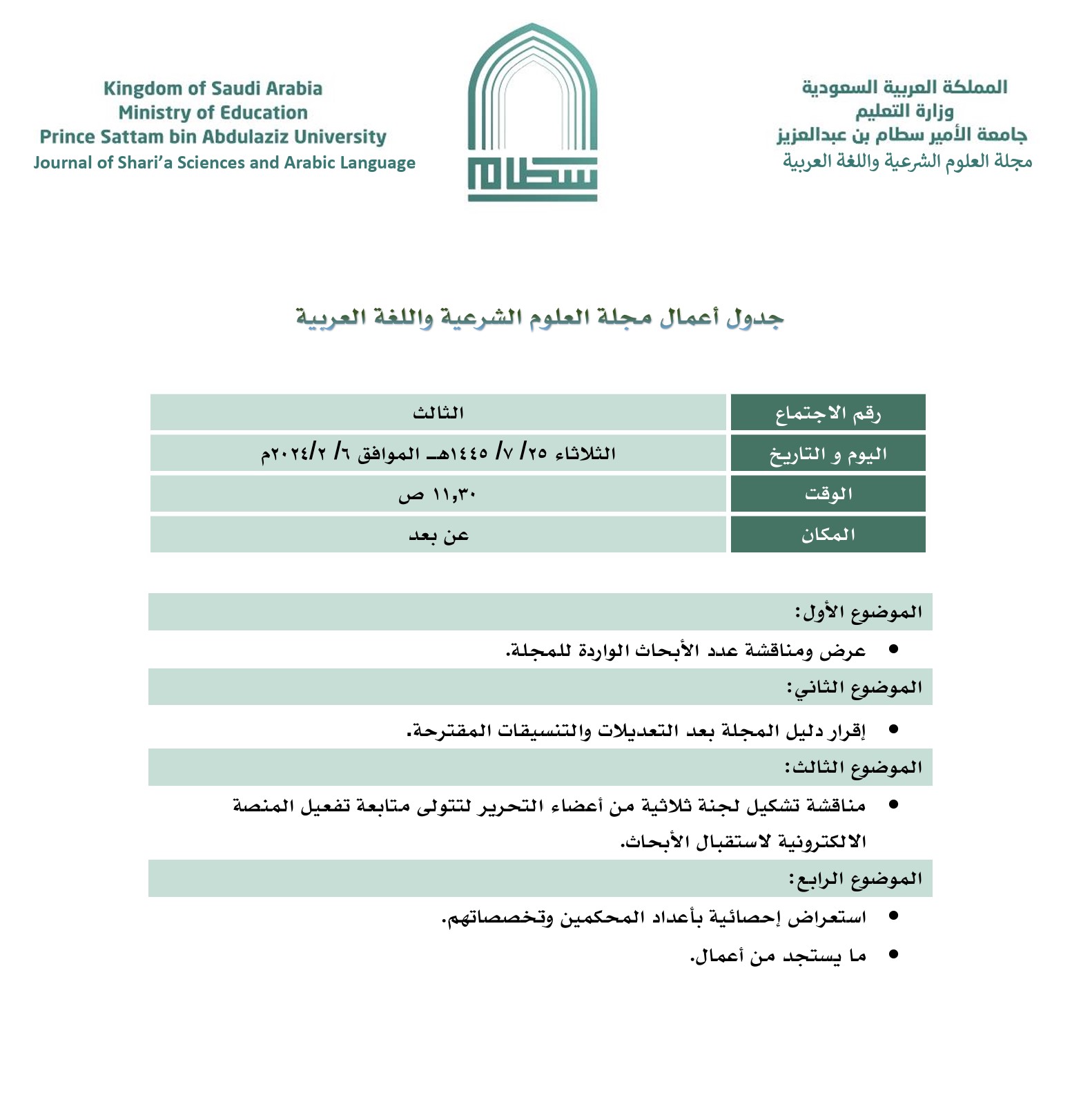 Chaired by the Editor-in-Chief of the Journal of Islamic Sciences and the Arabic Language, Prof. Maliha Al-Qahtani, The editorial board of the Journal of Islamic Sciences and Arabic Language held its third meeting on Thursday, 25- 7- 1445 AH, at exactly eleven o'clock morning,, on the topics on the agenda as follows: